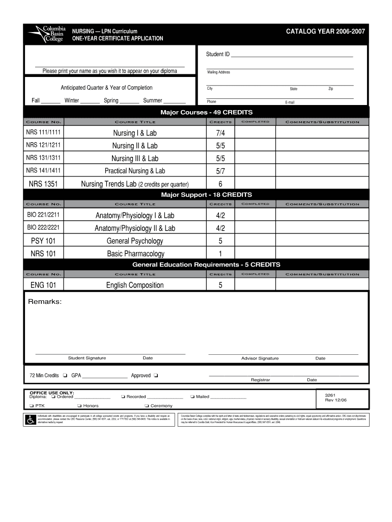CATALOG YEAR 2006-2007 NURSING LPN Curriculum ONE-YEAR CERTIFICATE APPLICATION Student ID Please print your name as you wish it to appear on your diploma Mailing Address Anticipated Quarter & Year