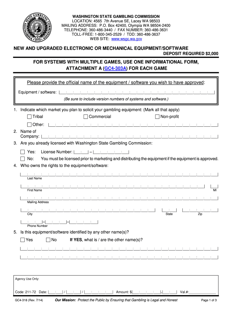 WASHINGTON STATE GAMBLING COMMISSION LOCATION: 4565 7th Avenue SE, Lacey WA 98503 MAILING ADDRESS: P.O. Box 42400, Olympia WA 98504-2400 TELEPHONE: 360-486-3440 / FAX NUMBER: 360-486-3631 TOLL-FREE: