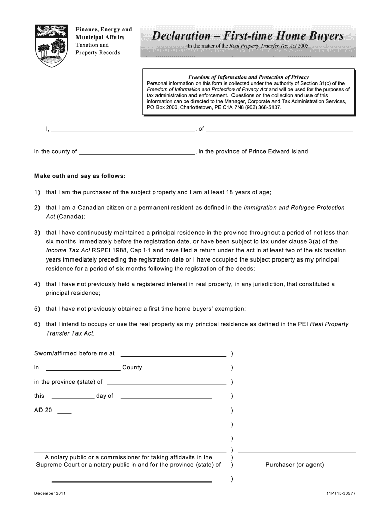 The First-time Home Buyers Taxation Declaration is a legal document used by purchasers in Prince Edward Island, Canada, to claim a tax exemption on their first property purchase under the Real Property Transfer Tax Act 2005.