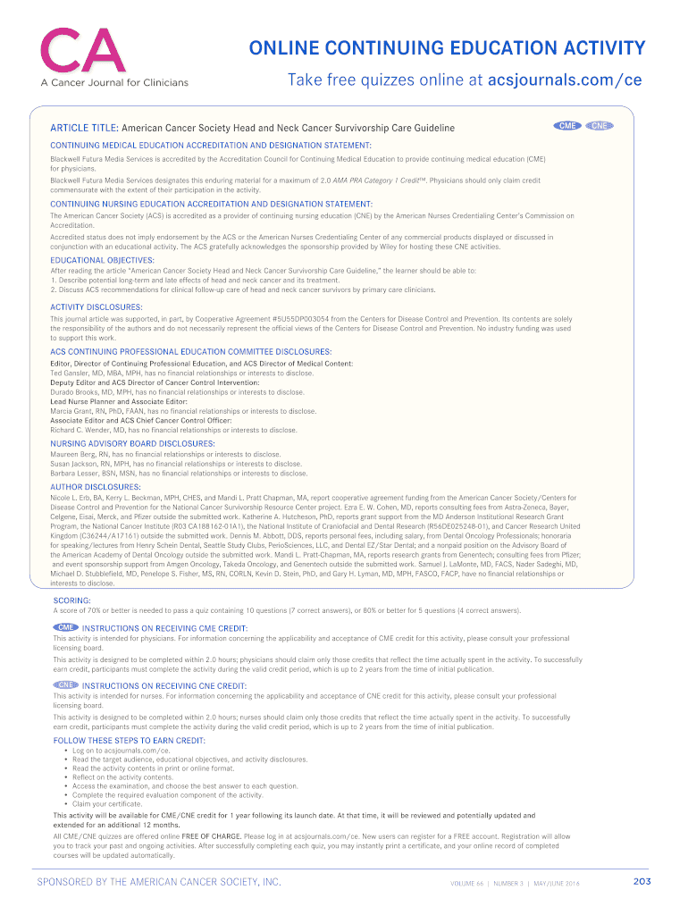 ARTICLE TITLE: American Cancer Society Head and Neck Cancer Survivorship Care GuidelineCMECONTINUING MEDICAL EDUCATION