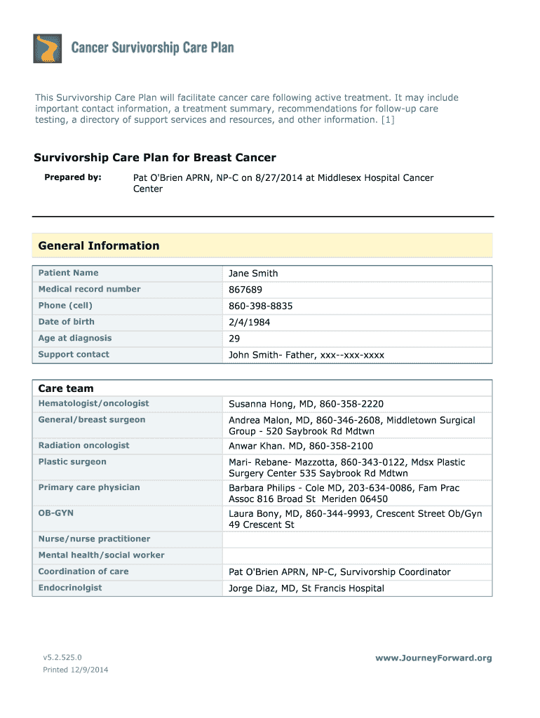 This Survivorship Care Plan will facilitate cancer care following active treatment. It may include important contact information, a treatment summary, recommendations for followup care testing, a