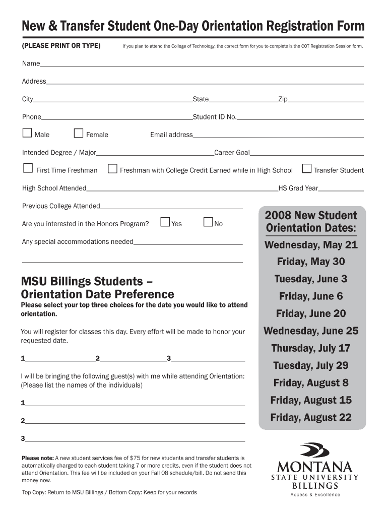 Eligibility to complete this form includes all new and transfer students arriving at the College of Technology, MSU Billings, who wish to participate in orientation sessions.