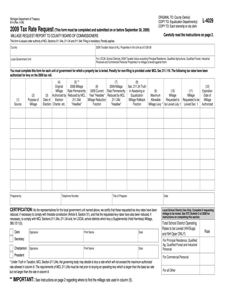 Sample of a Completed Michigan 2009 Tax Rate Request Form