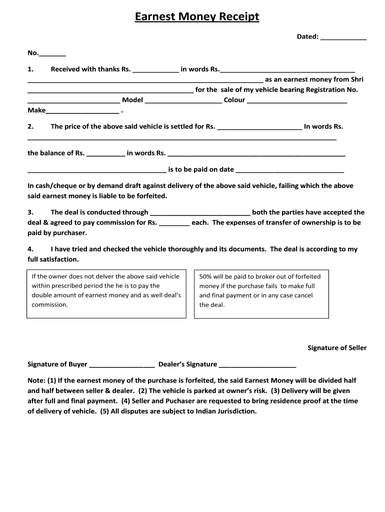 Earnest Money Receipt Dated: No. 1. Received with thanks Rs. in words Rs. as earnest money from Sari for the sale of my vehicle bearing Registration No. Model Color Make. 2. The price of the above