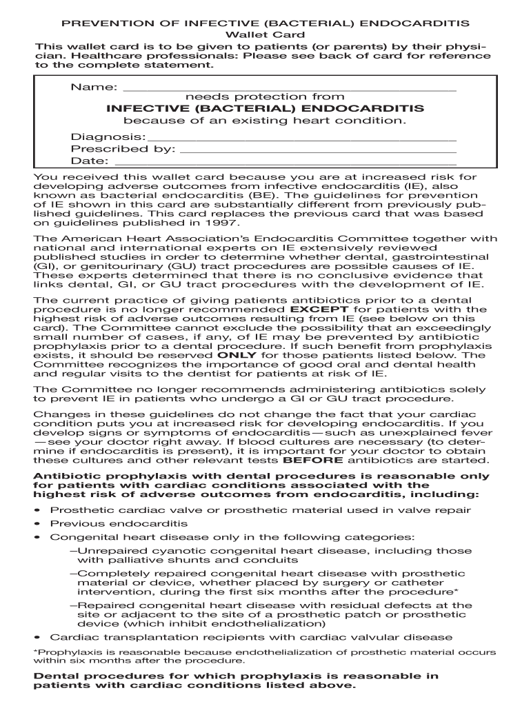 Completing the Infective Endocarditis Prevention Wallet Card should take only a few minutes, especially if you have all necessary information at hand before you start.