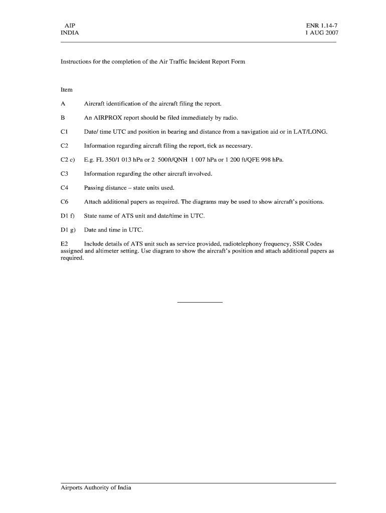 The Air Traffic Incident Report Form plays a crucial role in reporting aviation incidents within India's air traffic management system. This document serves as a standardized template for ensuring that essential information about incidents is captured accurately and promptly. Timely reporting through this form is vital for maintaining safety and adhering to regulatory compliance in aviation.