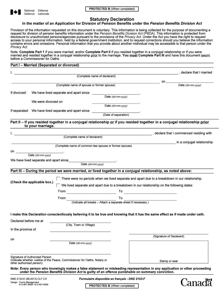The Statutory Declaration DND 2153-E is a legal form used by Canadians to apply for the division of pension benefits under the Pension Benefits Division Act.