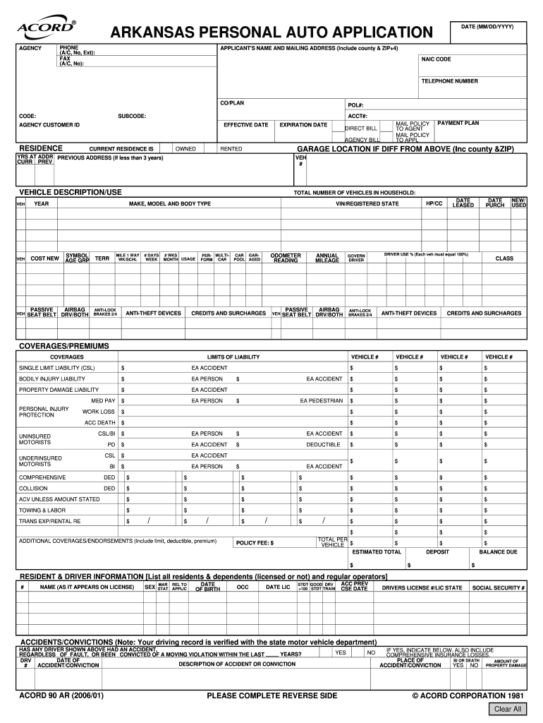 Any resident of Arkansas who owns a vehicle and requires personal auto insurance is eligible to complete the Arkansas Personal Auto Insurance Application.