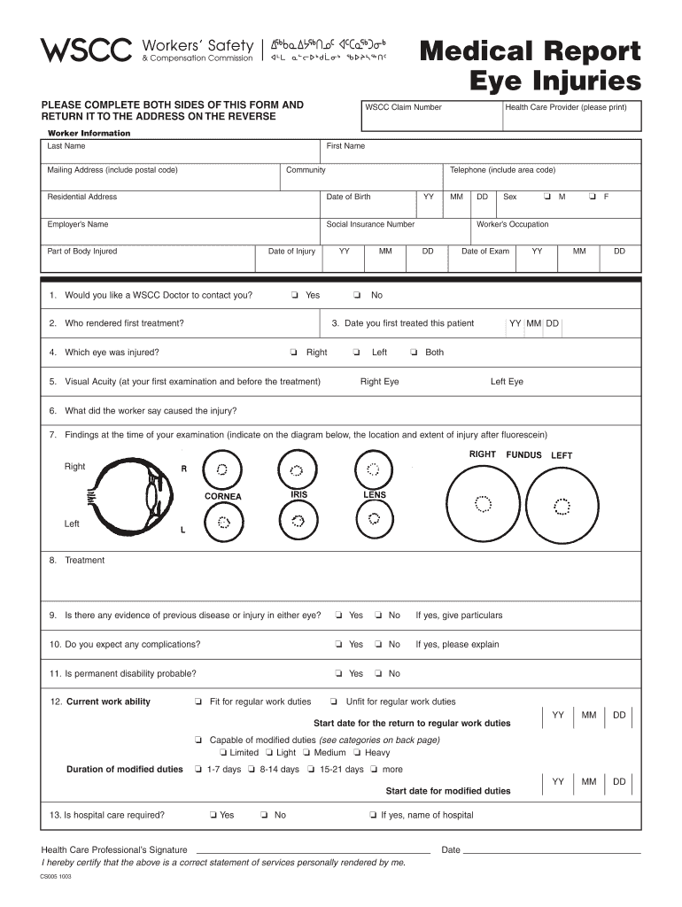 The Medical Report Eye Injuries is a healthcare document used by medical professionals to document eye injuries sustained by workers in Nunavut and the Northwest Territories.