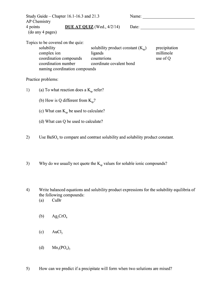 The AP Chemistry Study Guide serves as a valuable resource for high school students preparing for assessments in chemistry. This guide covers essential topics including solubility, Ksp calculations, and coordination compounds. Its significance lies in offering structured content that enhances student understanding and performance during quizzes in high school chemistry.