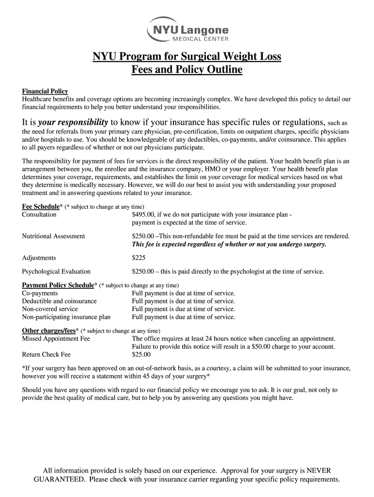 NYU Program for Surgical Weight Loss Fees and Policy Outline Financial Policy Healthcare benefits and coverage options are becoming increasingly complex. We have developed this policy to detail our