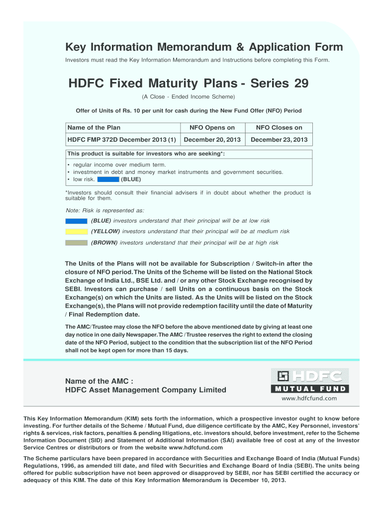 The HDFC Fixed Maturity Plans Application Form is designed for individual and institutional investors wishing to invest in the HDFC FMP 372D. All investors must meet the legal age and residency requirements as per Indian financial regulations.