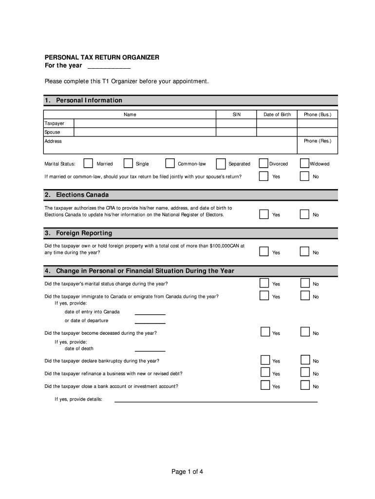 PERSONAL TAX RETURN ORGANIZER For the year Please complete this T1 Organizer before your appointment. 1. Personal Information Name SIN Date of Birth Phone (Bus.) Taxpayer Spouse Phone (Res.) Address