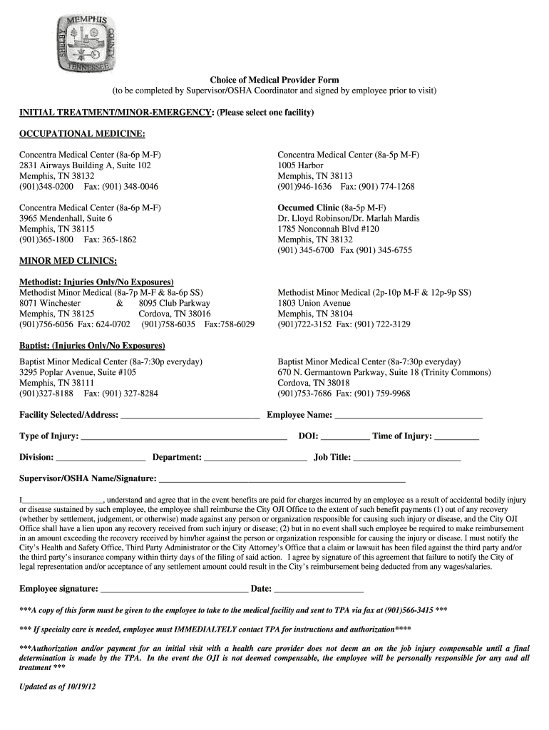 The Choice of Medical Provider Form is a medical consent document used by Tennessee employees to select a medical facility for initial treatment or minor emergencies.