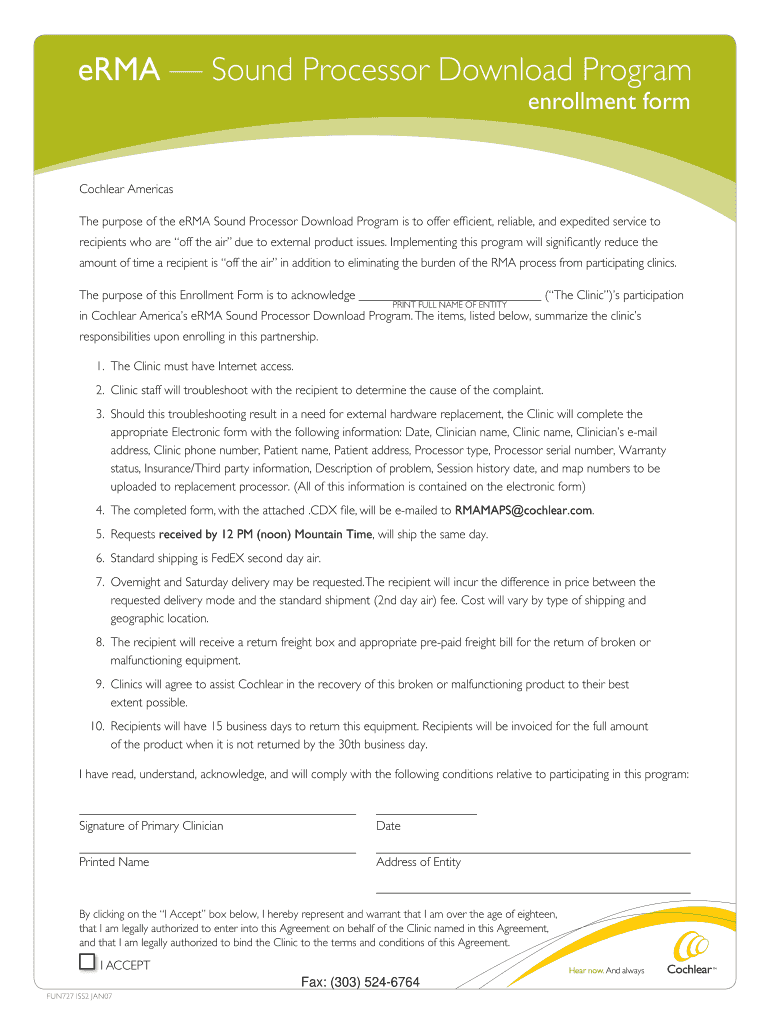 The eRMA Sound Processor Download Program Enrollment Form is a crucial document utilized by clinics and healthcare providers seeking to engage with Cochlear America’s program for expedited sound processor services. This form serves as a formal entry point into the program, allowing clinics to effectively manage and troubleshoot issues related to cochlear sound processors.