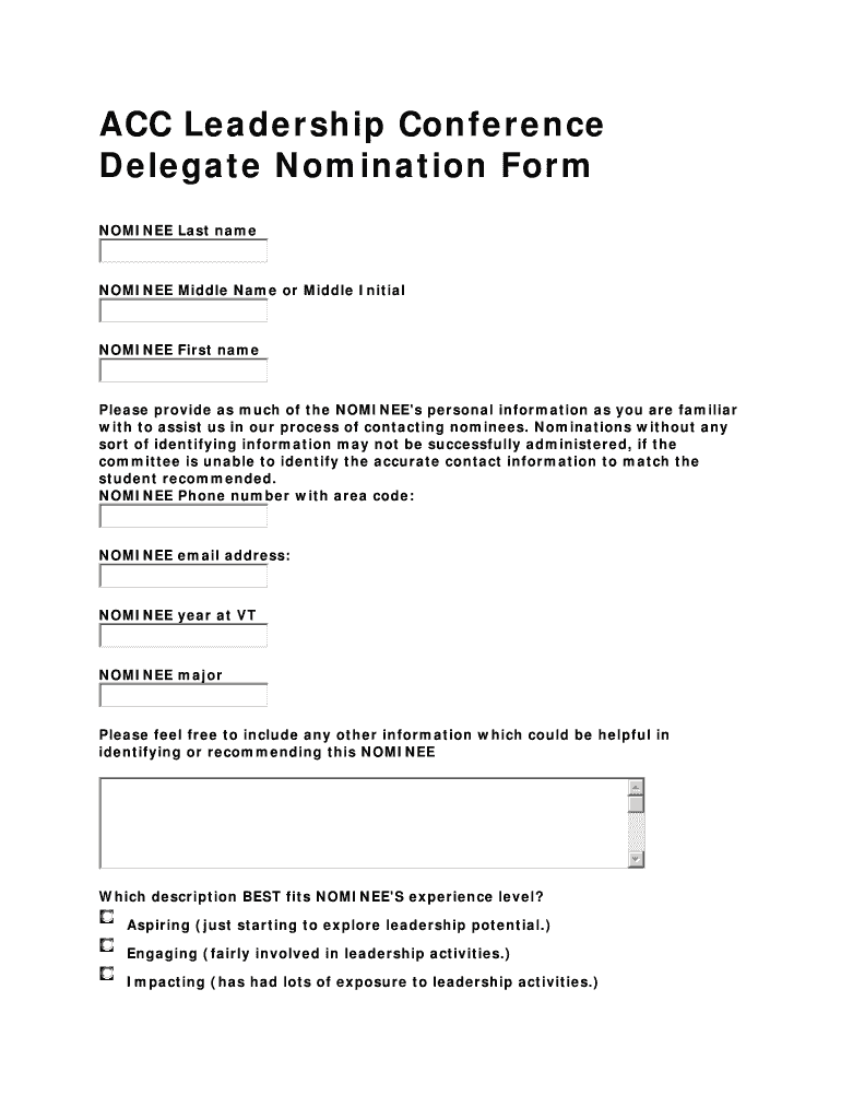 Get the free ACC Leadership Conference Delegate Nomination Form - cpe vt