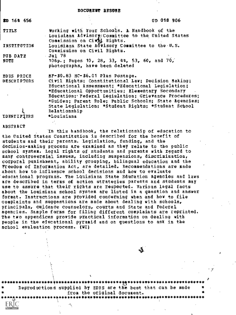 DOMENIC RESUME UDID 164 656 TITLEINSTITUTIONPUB DATE NOTEEDRS PRICE DESCRIPTORSIDENTIFIERS018 906Working with Your Schools.,A.Handbook of the Louisiana Advisor,Committee to the United States Commission