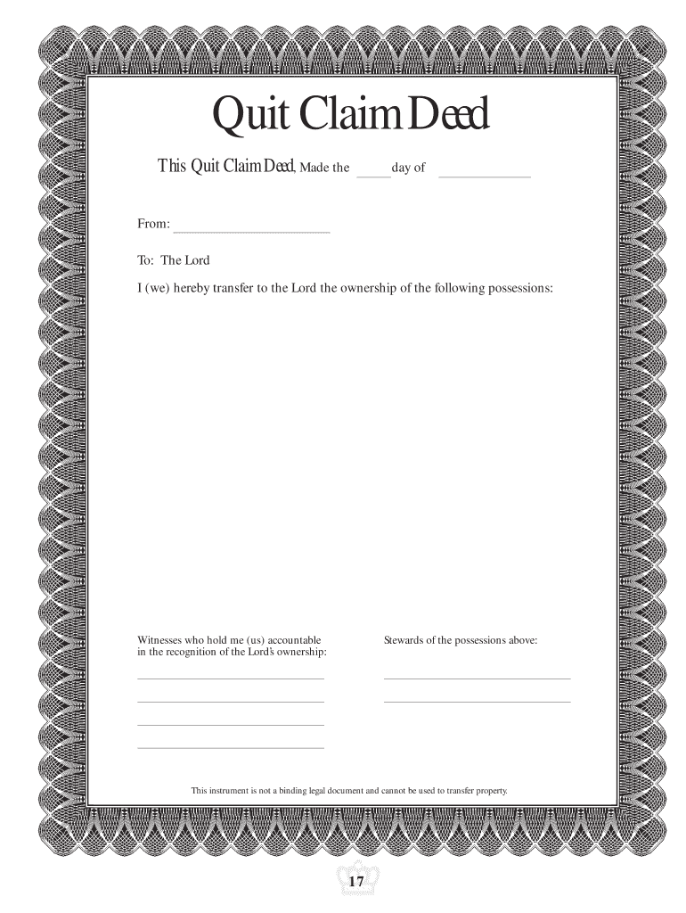 The Quit Claim Deed is a legal document used by individuals to transfer ownership of possessions non-bindingly to the Lord.