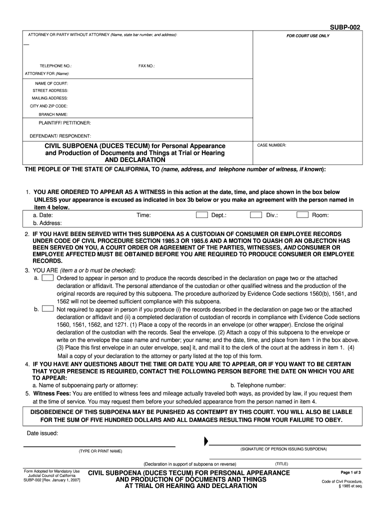 How to fill out the CA Subpoena Duces Tecum
