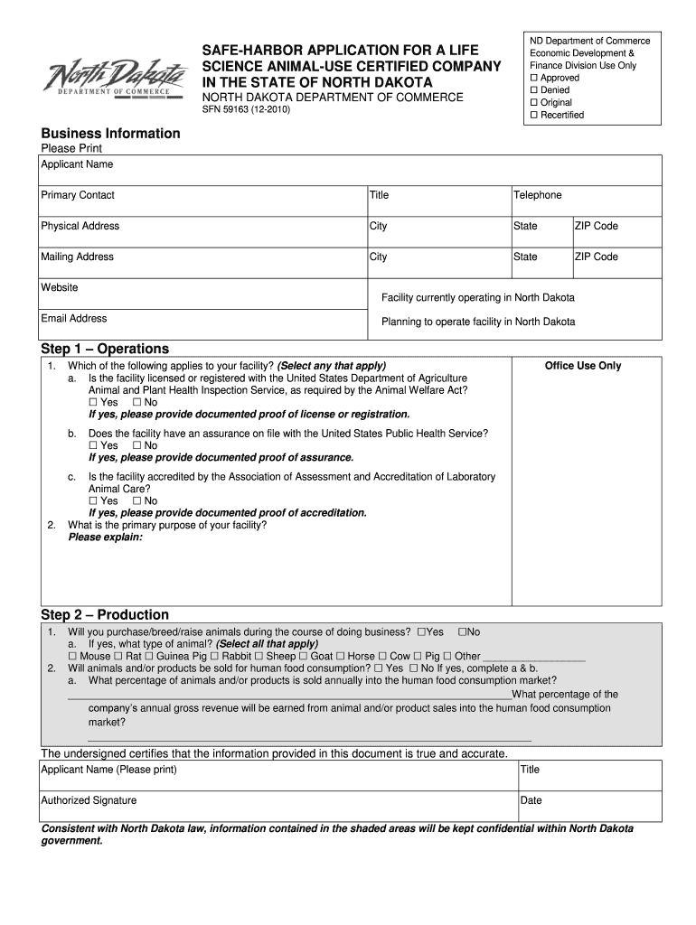 SAFE-HARBOR APPLICATION FOR A LIFE SCIENCE ANIMAL-USE CERTIFIED COMPANY IN THE STATE OF NORTH DAKOTA DEPARTMENT OF COMMERCE SON 59163 (12-2010) ND Department of Commerce Economic Development & Finance