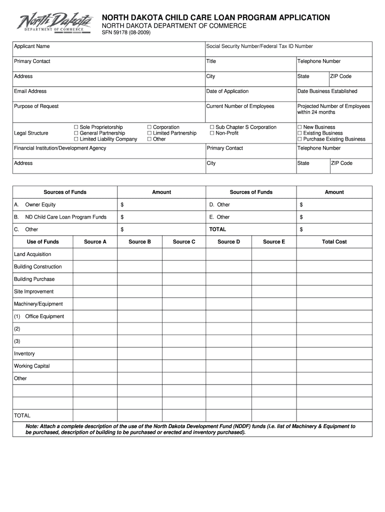 NORTH DAKOTA CHILD CARE LOAN PROGRAM APPLICATION NORTH DAKOTA DEPARTMENT OF COMMERCE SON 59178 (08-2009) Applicant Name Social Security Number/Federal Tax ID Number Primary Contact Title Telephone