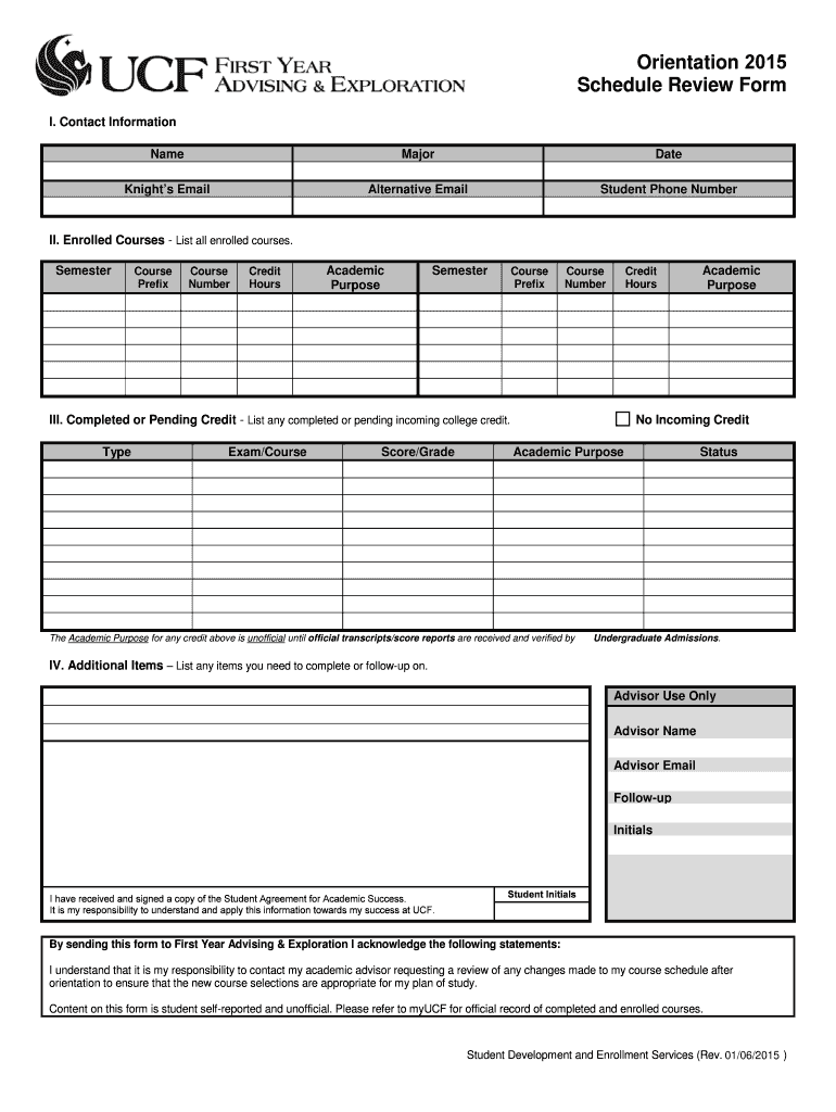 The Schedule Review Form is an essential tool for students at the University of Central Florida (UCF), designed to assist them in reporting their enrolled courses and any completed or pending credits. This form plays a significant role during UCF orientation, providing a streamlined process for incoming students to present their academic standing and needs.