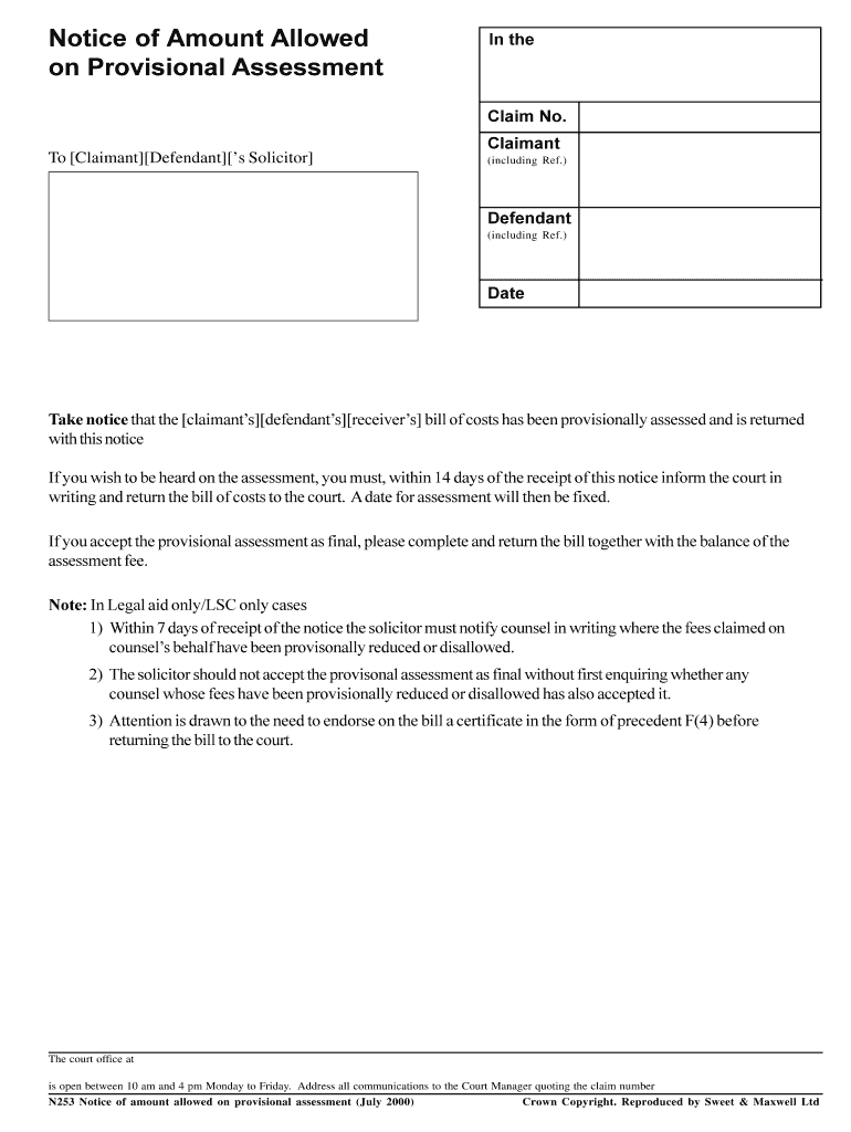 Notice of Amount Allowed on Provisional Assessment In the Claim No. To Claimant Defendant s Solicitor Claimant (including Ref.) Defendant (including Ref.) Date Take notice that the claimants defendants