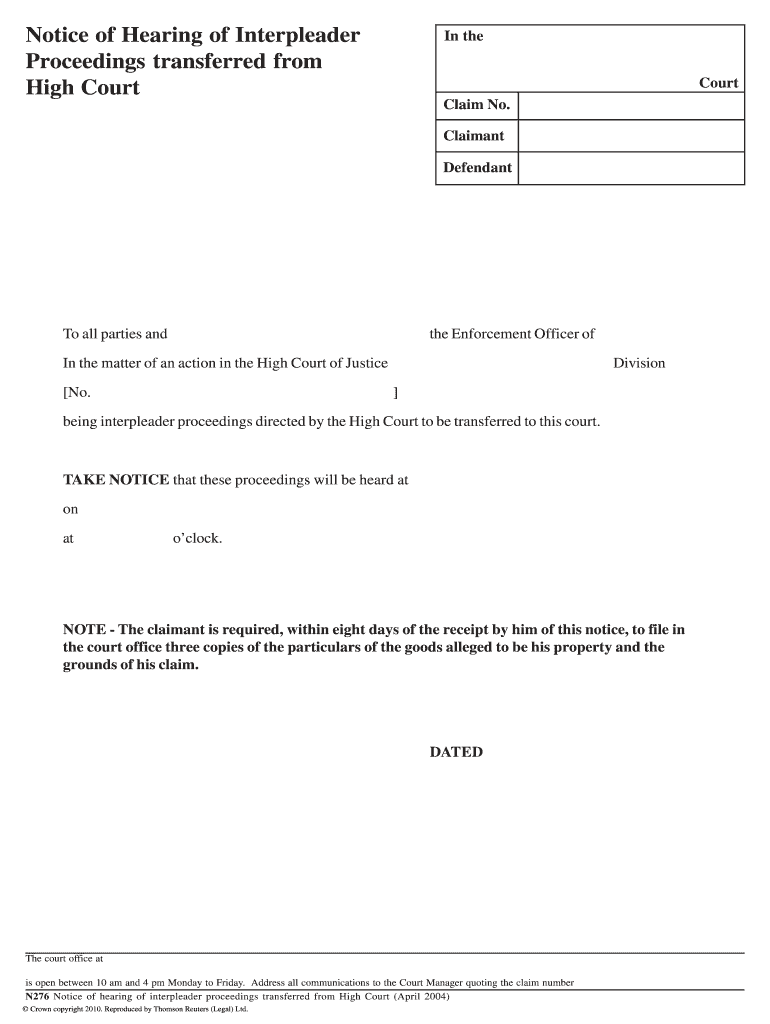 Get the free Notice of Hearing of Interpleader Proceedings transferred from High bb