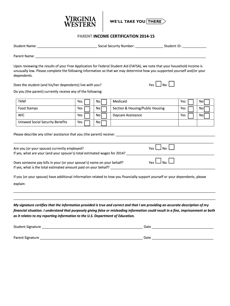 The Parent Income Certification Form 2014-15 plays a critical role in the financial aid process for students. This form is specifically designed to verify the financial situation of students applying for federal student aid through the Free Application for Federal Student Aid (FAFSA). By submitting this form, educational institutions can assess the financial circumstances of families with unusually low household income, thus ensuring that students receive the financial aid they need.