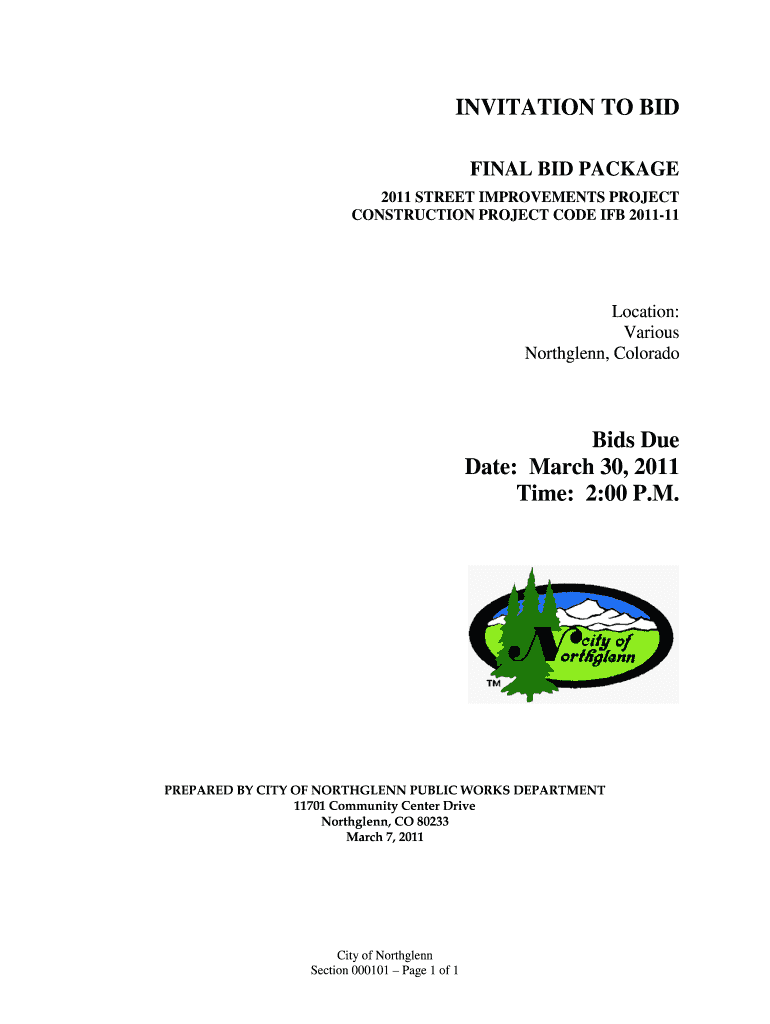 INVITATION TO BID FINAL BID PACKAGE 2011 STREET IMPROVEMENTS PROJECT CONSTRUCTION PROJECT CODE IF 2011-11 Location: Various Northglenn, Colorado Bids Due Date: March 30, 2011, Time: 2:00 P.M. PREPARED