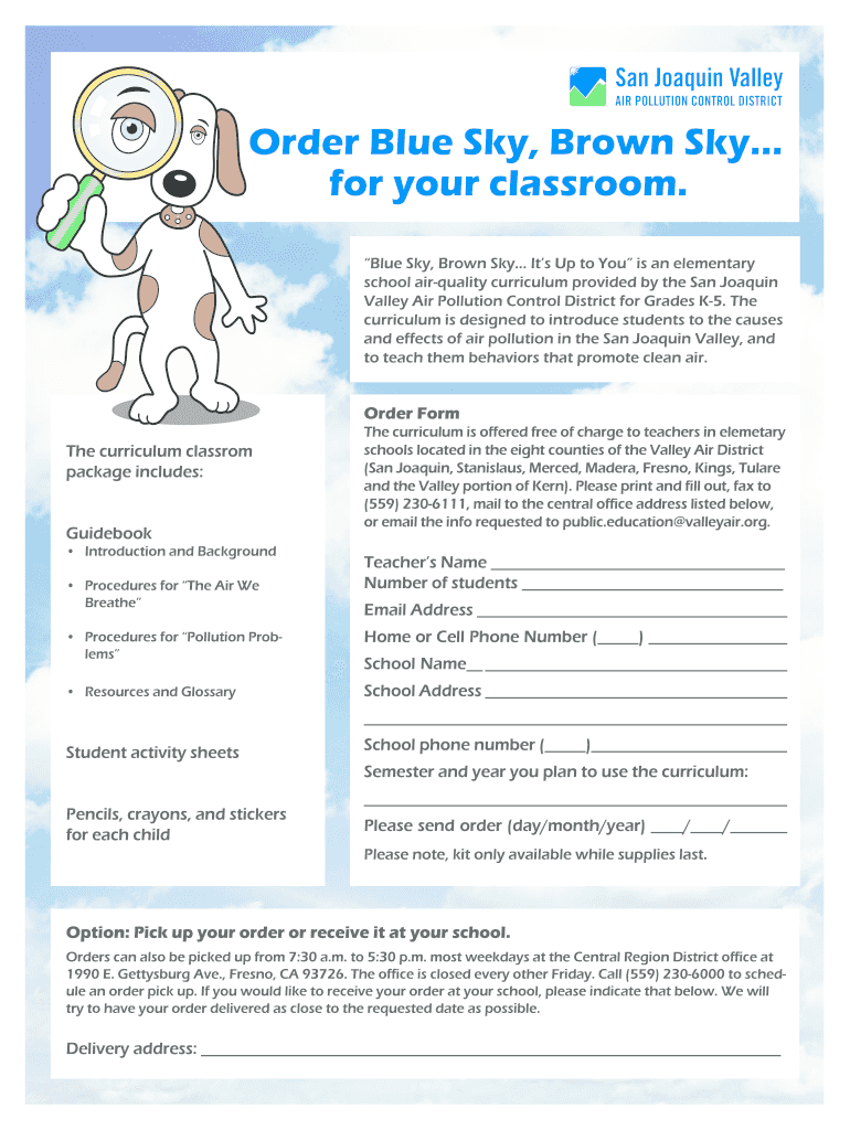 The Blue Sky, Brown Sky Order Form is a document used by elementary school teachers in California to request free air-quality curriculum resources for Grades K-5.