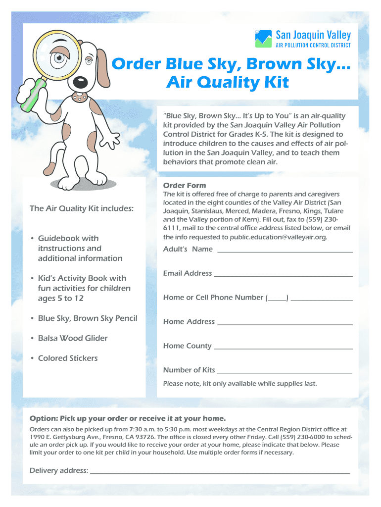 The Air Quality Kit Order Form serves families in the San Joaquin Valley by enabling them to request free air quality education kits specifically designed for children in grades K-5. This educational initiative focuses on air pollution, promoting awareness and understanding among young learners.