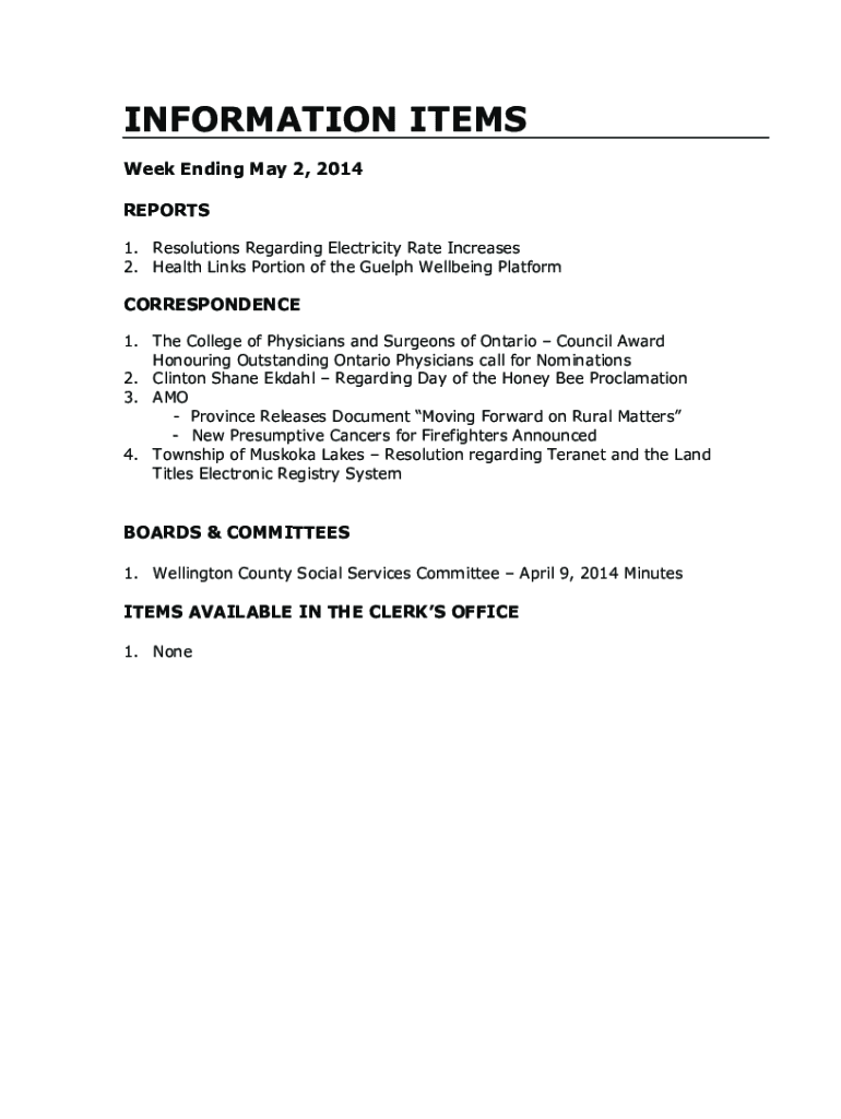 INFORMATION ITEMS Week Ending May 2, 2014, REPORTS 1. Resolutions Regarding Electricity Rate Increases 2. Health Links Portion of the Guelph Wellbeing PlatformCORRESPONDENCE 1. The College of Physicians