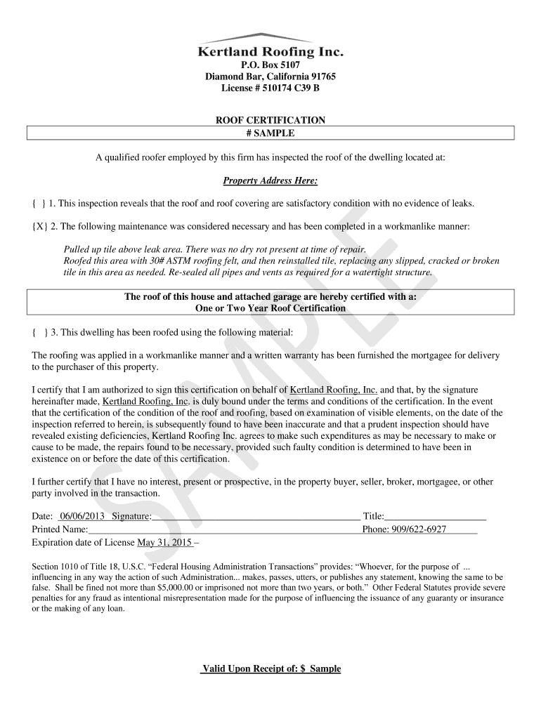 Only qualified roofing contractors who have inspected the property can fill out the Roof Certification Form to maintain credibility and deliver accurate information.