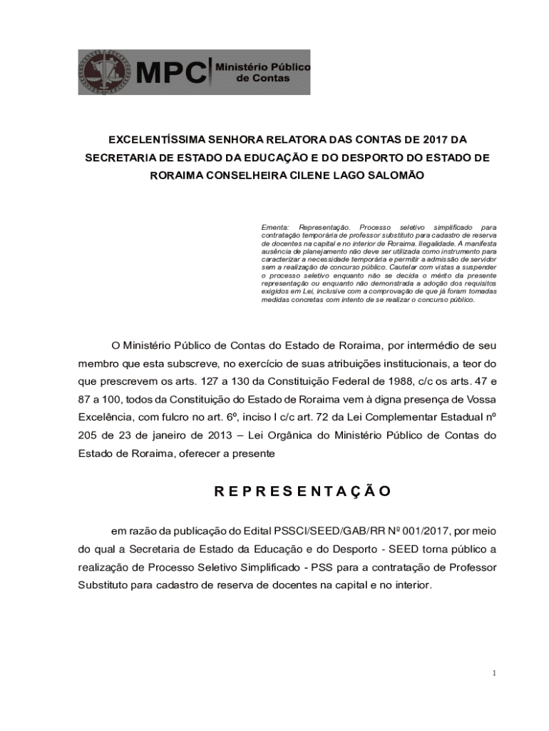 EXCELENTSSIMA SENHORA RELATORA DAS CONTAS DE 2017 DA SECRETARIA DE ESTADO DA EDUCAO E DO DESPORTO DO ESTADO DE RORAIMA CONSELHEIRA CILENE LAGO SALOMOEmenta: Representao. Processo seletivo simplificado