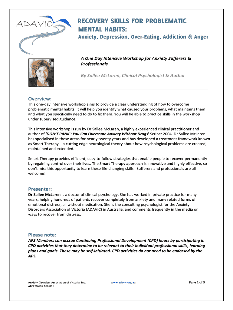 RECOVERY SKILLS FOR PROBLEMATIC MENTAL HABITS: Anxiety, Depression, Over-Eating, Addiction & Anger A One-Day Intensive Workshop for Anxiety Sufferers & Professionals By Sallie McLaren, Clinical Psychologist