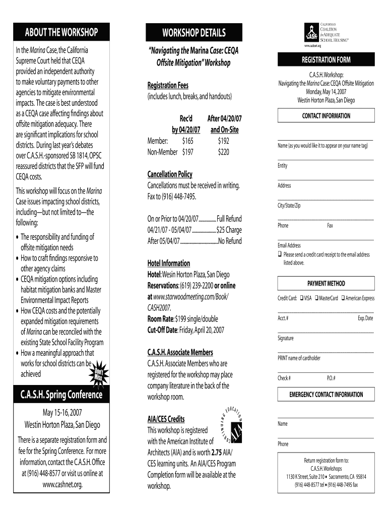 Navigating the Marina Case: CEA Offsite Mitigation Monday, May 14, 2007, Weston Horton Plaza, San Diego Registration: Lunch: Program: 12:00 p.m. 12:00 1:00 p.m. 00 4 4:00 p.m. C.A.S.H. WORKSHOP IMPORTANT