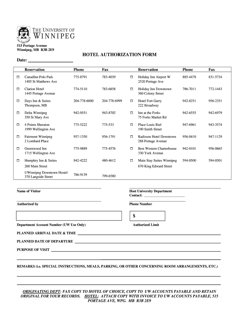 The Hotel Authorization Form is a business document used by the University of Winnipeg to authorize and manage hotel accommodations for visitors.