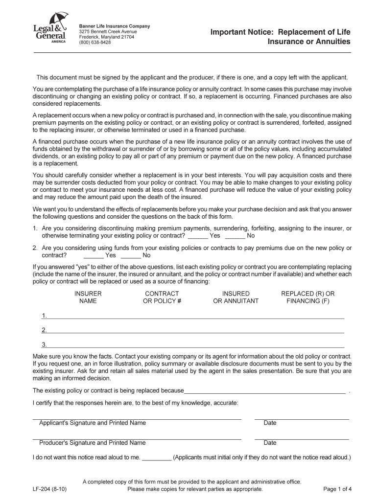 The Banner Life Insurance Replacement Notice is designed for individuals who are replacing their life insurance or annuities. This includes both applicants and producers who assist them in the process.