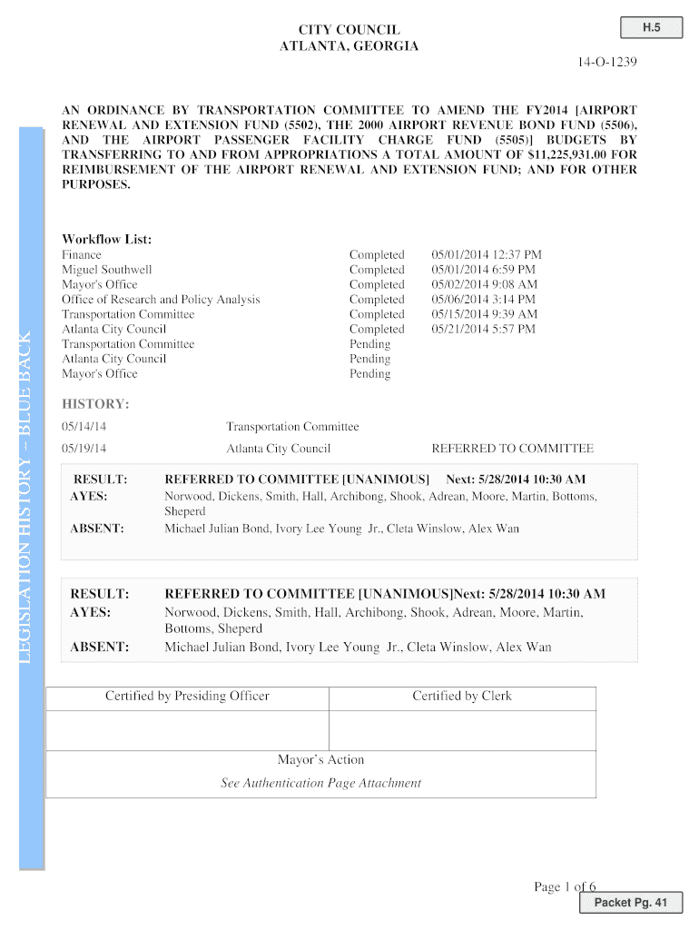 H.5 CITY COUNCIL ATLANTA, GEORGIA 14O1239 AN ORDINANCE BY TRANSPORTATION COMMITTEE TO AMEND THE FY2014 AIRPORT RENEWAL AND EXTENSION FUND (5502), THE 2000 AIRPORT REVENUE BOND FUND (5506), AND THE