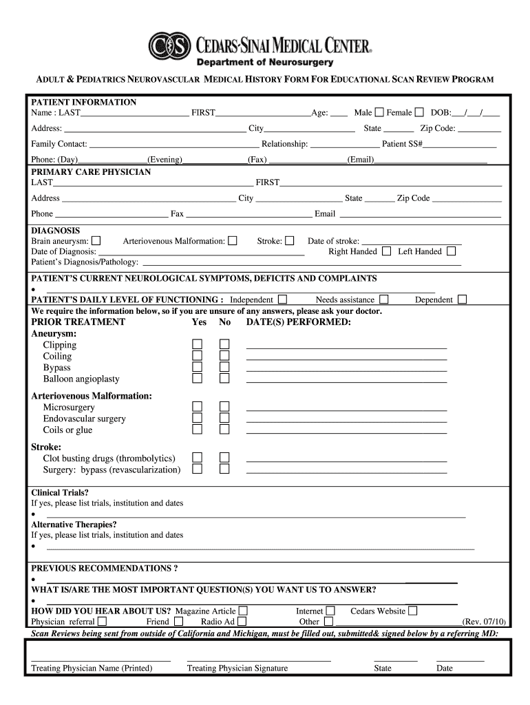 Get the free ADULT PEDIATRICS NEUROVASCULAR MEDICAL HISTORY FORM FOR ... - cedars-sinai