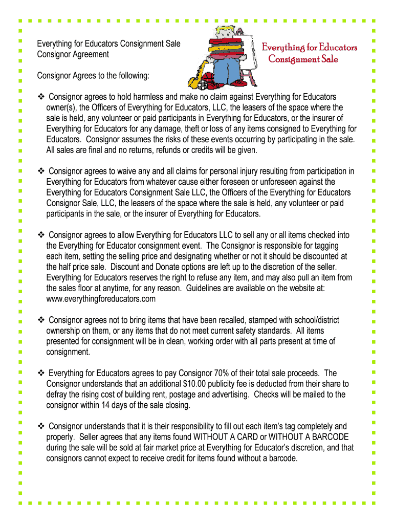 Everything for Educators Consignment Sale Consignor Agreement Everything for Educators Consignment Sale Consignor Agrees to the following: Consignor agrees to hold harmless and make no claim against