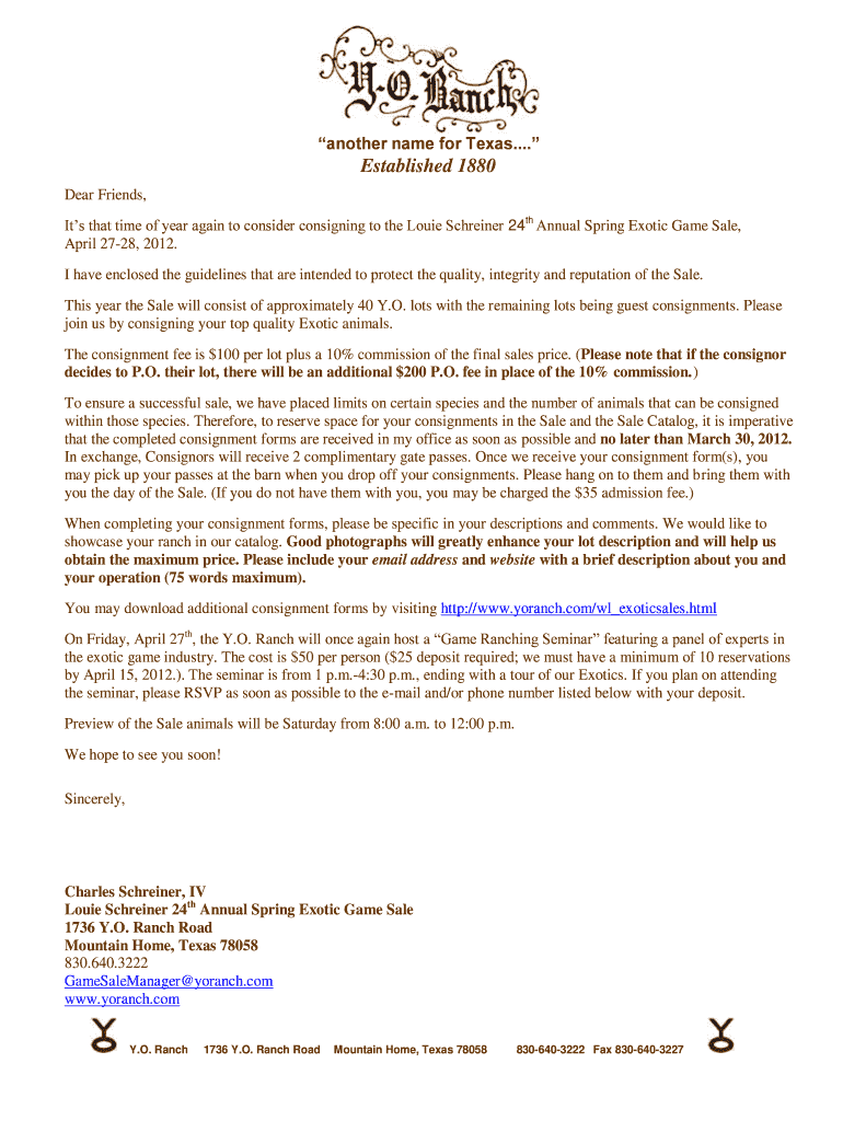 Another name for Texas.... Established 1880 Dear Friends, It's that time of year again to consider consigning to the Louie Schreiner 24th Annual Spring Exotic Game Sale, April 2728, 2012. I have enclosed