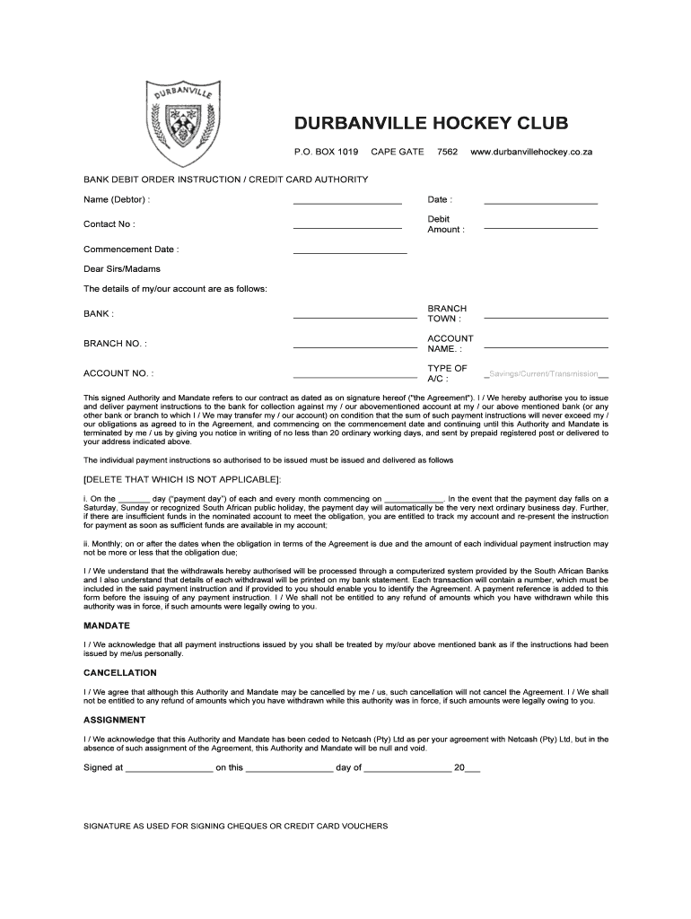 DURBANVILLE HOCKEY CLUB P.O. BOX 1019 CAPE GATE 7562 www.durbanvillehockey.co.za BANK DEBIT ORDER INSTRUCTION / CREDIT CARD AUTHORITY Name (Debtor) : Date : Contact No : Debit Amount : Commencement