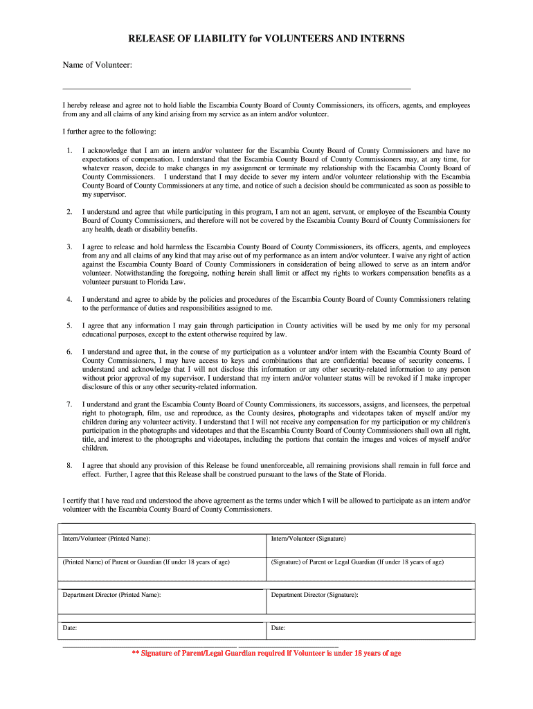 RELEASE OF LIABILITY for VOLUNTEERS AND INTERNS Name of Volunteer: I hereby release and agree not to hold liable the Escambia County Board of County Commissioners, its officers, agents, and employees