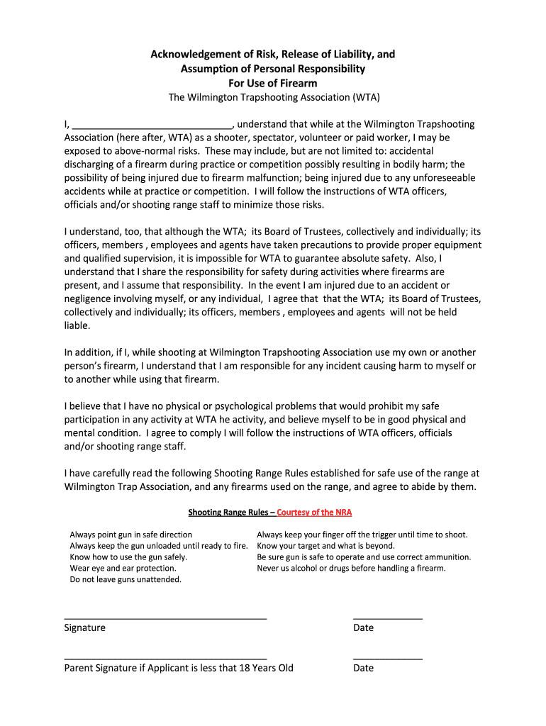 Acknowledgement of Risk, Release of Liability, and Assumption of Personal Responsibility For Use of Firearm The Wilmington Trapshooting Association (WTA) I, understand that while at the Wilmington