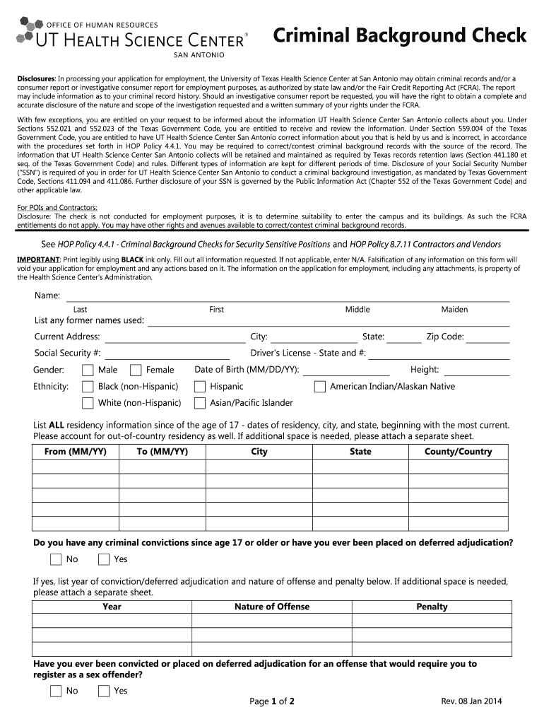 Disclosures: In processing your application for employment, the University of Texas Health Science Center at San Antonio may obtain criminal records and/or a