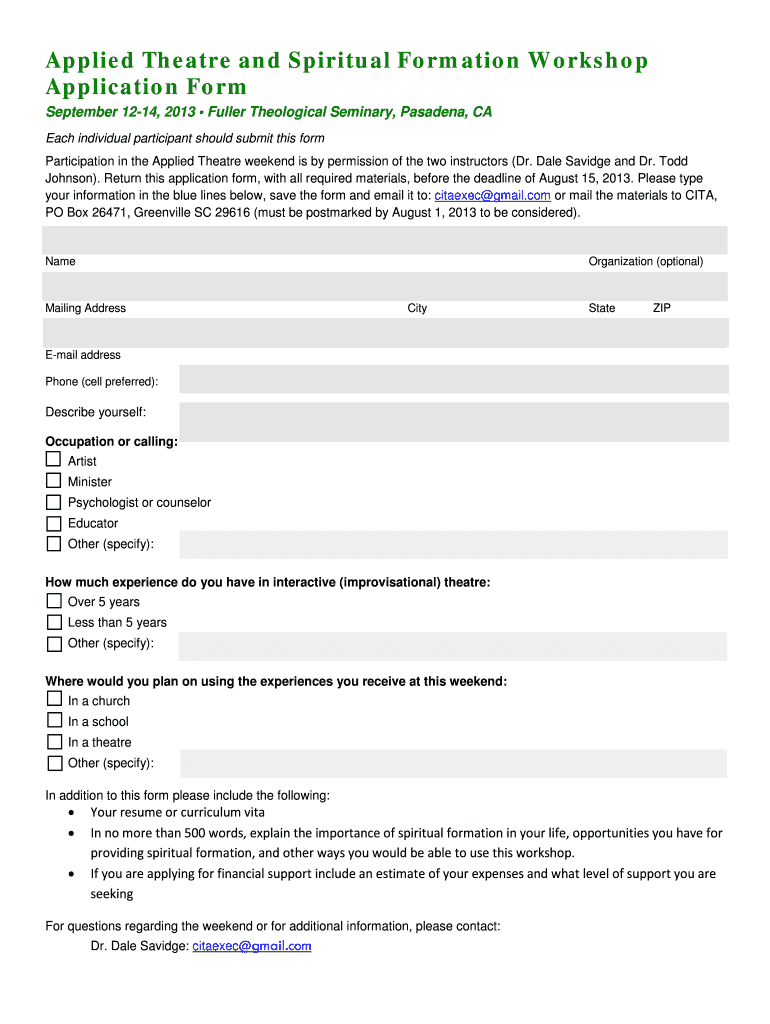 Applied Theater and Spiritual Formation Workshop Application Form September 12-14, 2013 Fuller Theological Seminary, Pasadena, CA Each individual participant should submit this form Participation