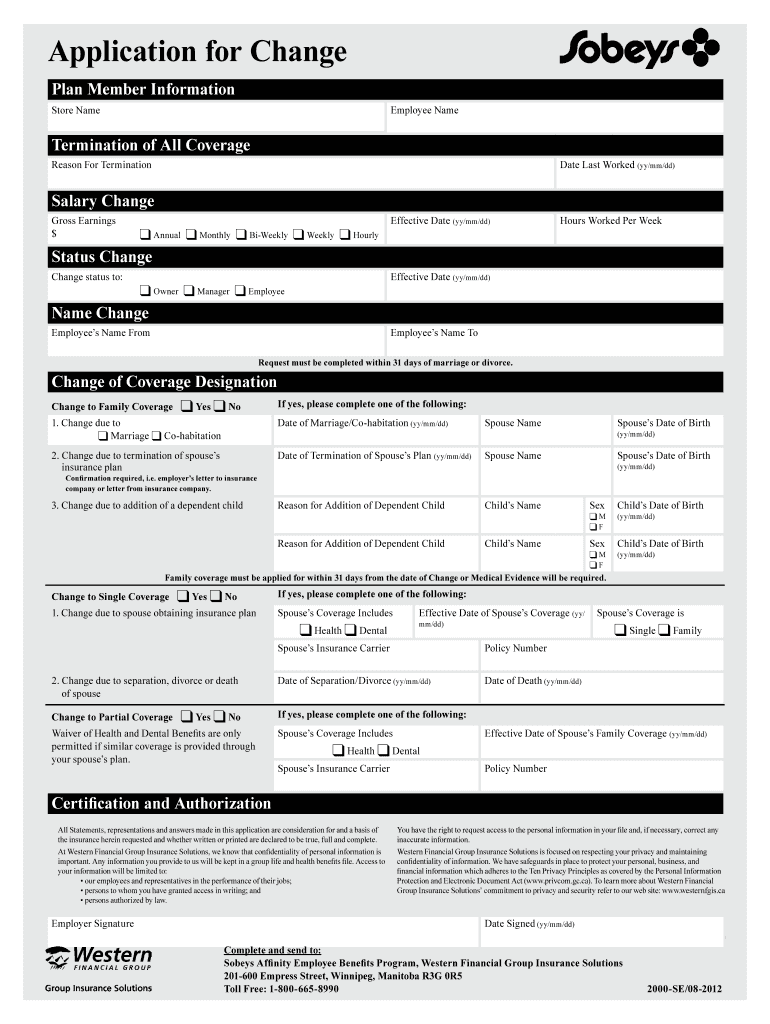 All employees enrolled in benefits coverage under the Sobeys Affinity Employee Benefits Program can use the Employee Benefits Change Form to request changes.