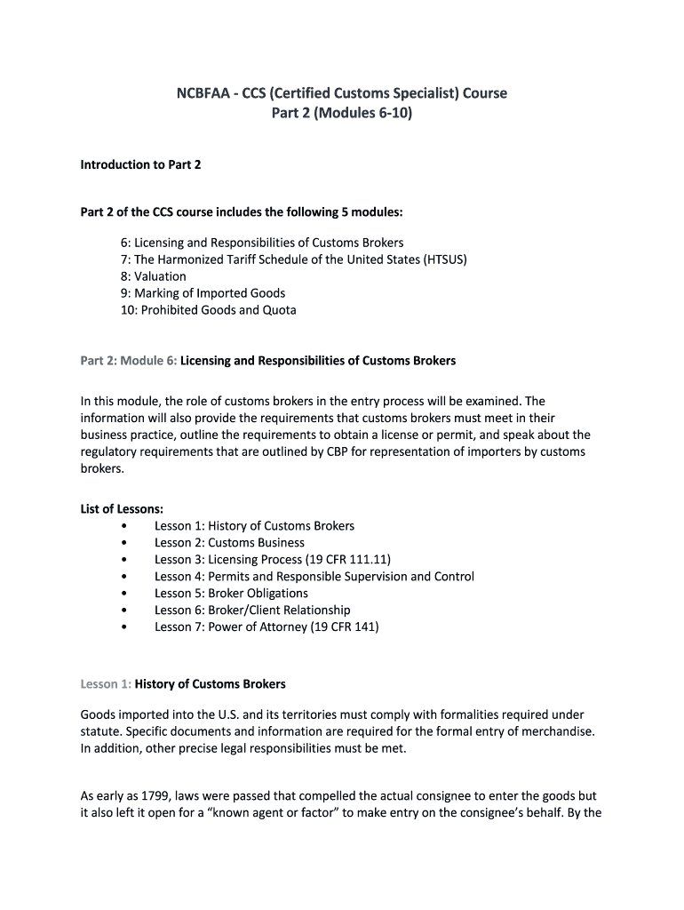 NCB FAA CCS (Certified Customs Specialist) Course Part 2 (Modules 610) Introduction to Part 2 Part 2 of the CCS course includes the following 5 modules: 6: Licensing and Responsibilities of Customs